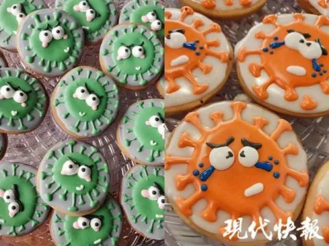 " 這些糖霜餅干之間是有關聯(lián)的。其中兩款是新冠病毒圖案,一款是很囂張的樣子,一款是被我們打敗的樣子,是靠什么打敗的呢?靠穿防護服的醫(yī)護人員,靠打疫苗、測溫和勤洗手 …… 所以另外六款我們做了防護服、溫度計這些圖案。" 王洵告訴現(xiàn)代快報記者,她和同事一起設計圖案,邀請會烘焙的朋友參與制作,并手寫了感謝信,和餅干一起寄出。