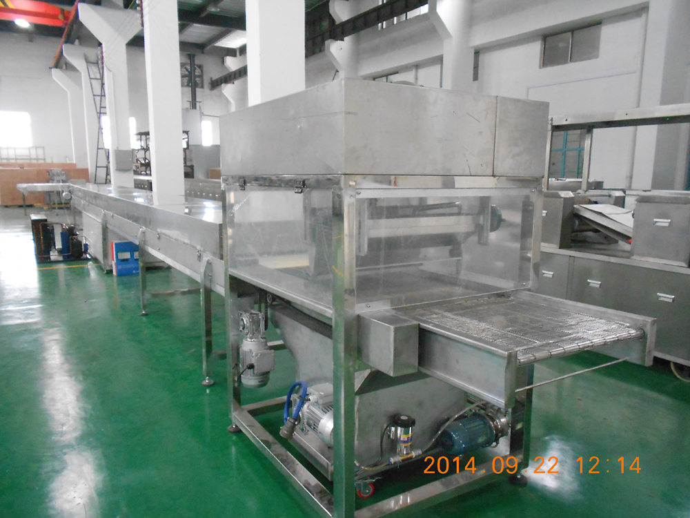 本機是生產花色巧克力品種的專用設備,能在多種食品表面浸涂巧克力漿料,諸如威化,餅干,蛋卷,蛋黃派,膨化食品等,形成多種口味獨特的巧克力制品。