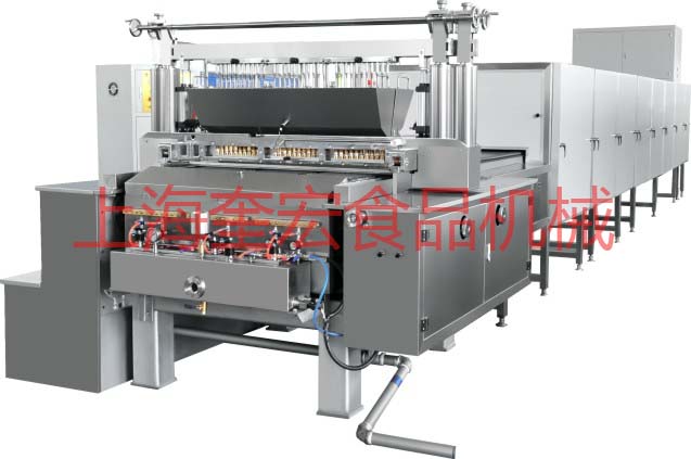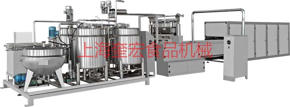 該生產線是根據QQ糖特殊的生產工藝要求而研發的用于生產膠體軟糖的生產設備。可連續生產各種形狀以果膠或明膠為基礎的膠體軟糖(QQ糖)。它是一種生產高級膠體糖果的理想設備。通過更換模具,同一個機器上還可生產澆注硬糖。衛生結構設計,可生產單色,雙色QQ糖;在線完成香精色素,酸液的定量加注混合。高度自動化生產不僅能生產出質量穩定,還能節省人力和占用空間從而降低生產成本。